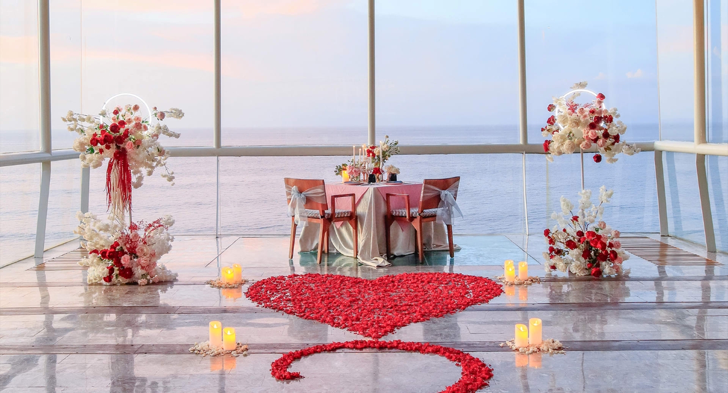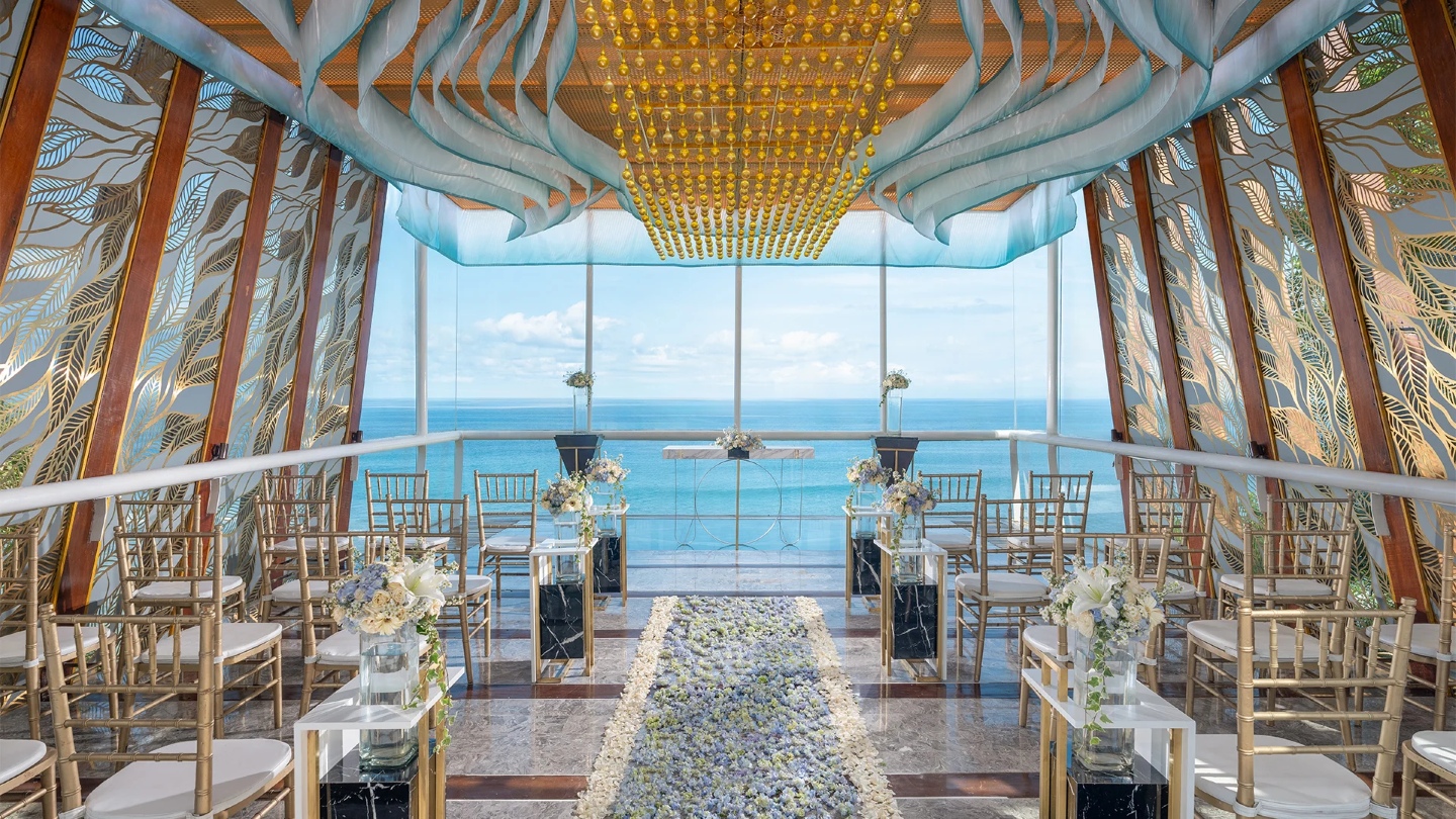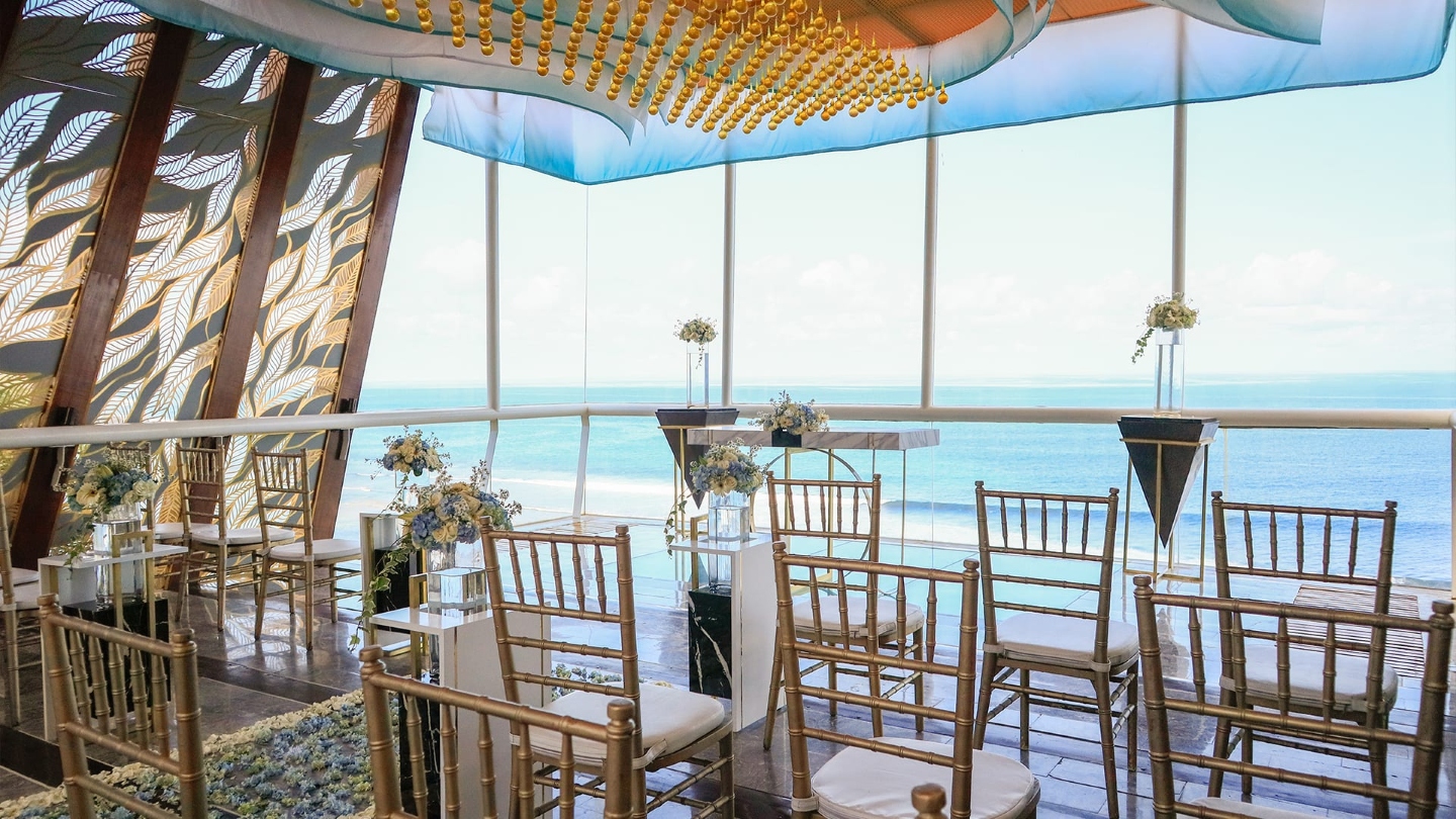 Dewa Dewi Chapel: Up to 50 guests. Modern glass chapel on the cliff edge, offering 360-degree ocean views. Ideal for intimate ceremonies.