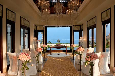The cloud nine chapel is located within the St. Regist resort , it is  star wood property which nestled within Nusa Dua tourist resort. Elegant wedding chapel with modern material weds antique interior design to create an air of timeless elegance. A kind to a glass house,the cloud nine wedding chapel enhances the natural sunlight streaming through reflecting the rich surroundings of the room. With blue sea view back drop create an intimate wedding romance.Can accommodate  about 40–50 persons inside the chapel.