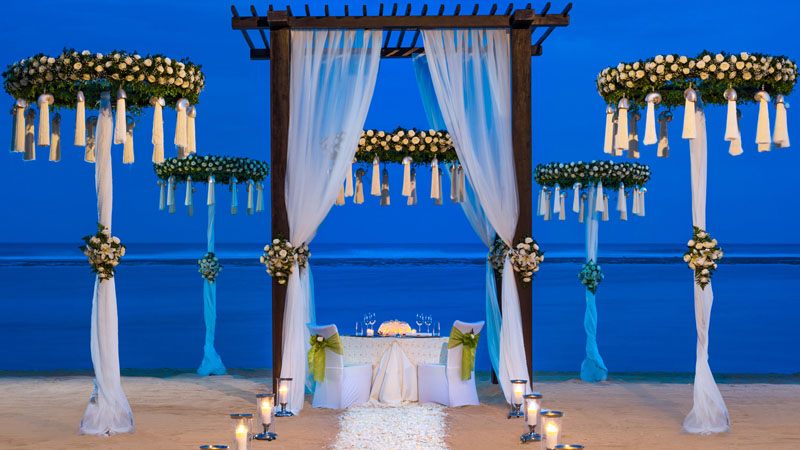 The cloud nine chapel is located within the St. Regist resort , it is star wood property which nestled within Nusa Dua tourist resort. Elegant wedding chapel with modern material weds antique interior design to create an air of timeless elegance. A kind to a glass house,the cloud nine wedding chapel enhances the natural sunlight streaming through reflecting the rich surroundings of the room. With blue sea view back drop create an intimate wedding romance.Can accommodate about 40–50 persons inside the chapel.