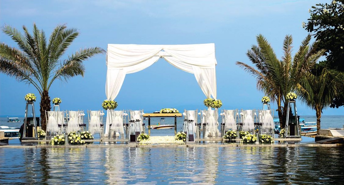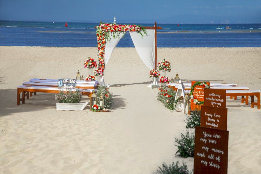 The Sakala Resort Tanjung Benoa offers various choice of wedding venue; water wedding, beach wedding, chapel wedding, sky tower wedding venue, pavillion and also ballroom. The Sakala wedding venue is located accross the road from their accomodation area facing to the east and it is possible also for sunrise wedding