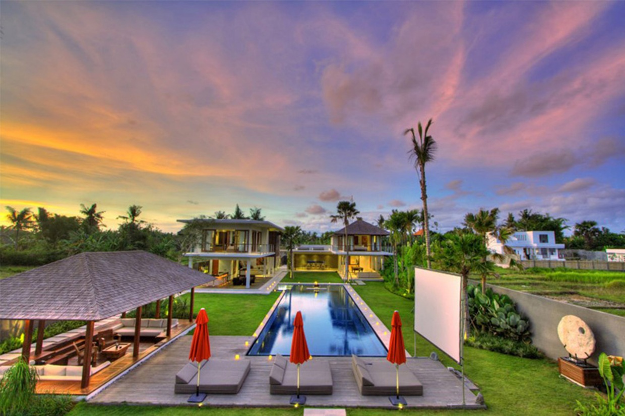 Villa Kalyani is located in the heart of Canggu, among the rippling rice fields. This villa has five luxurious ensuite bedrooms, and complete modern facilities such as dance floors, dj booth, indoor/outdoor movie theatre, and 22- metre pool. This villa also provides two bicycles that can be ridden to explore the scenic rice-field landscape and rural villages.