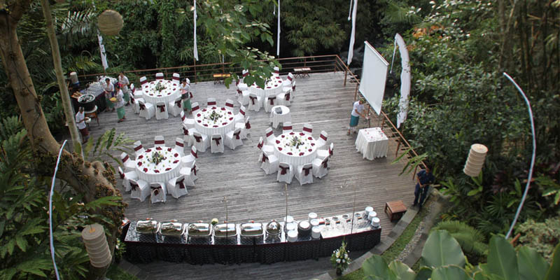 Located in Bisma, Komaneka at Bisma is nestled in Campuhan River valley with amazing views, sloping rice fields, and coconut groves nearby. Your wedding can be held in Wanasmara Chapel. Wanasmara Chapel Ubud is built a place to solemnize love. The name "Wanasmara" means "Forest of Love" in Sanskrit, a name perfectly suitable as it is located amongst tropical treetops and dance foliage along the Campuhan River. The pavilion was almost entirely made of wood and glass, with touch reminiscent of the entirely unique Toraja traditional house architecture at 72 sqm. This pavilion accommodate up to 48 people comfortably, it is an ideal setting for a private and romantic Bali wedding attended by family and close friends.
