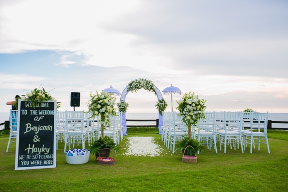 On 21 April 2018, Benjamin and Hayley exchanged their vows at New Kuta Golf. This place is perched above a limestone cliff and offers a breathtaking views of Indian Ocean. Their wedding ceremony and wedding reception was held on the perfectly manicured green lawn at New Kuta Golf. In the evening, they took photo with a stunning sunset as a background.