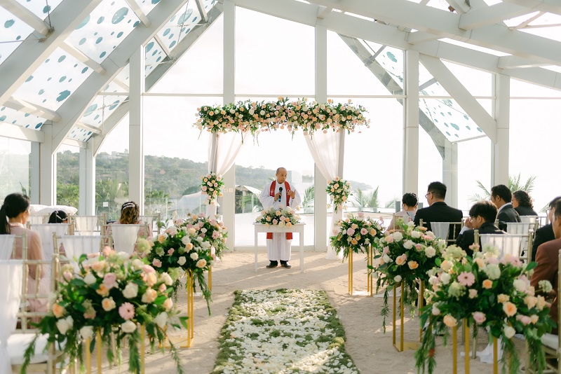 Experience the perfect Bali wedding at Le Meridien Jimbaran, featuring a stunning rooftop chapel wedding pavilion with panoramic views of Jimbaran Bay. This exquisite Bali wedding venue offers various accommodation options for couples and guests, ensuring a comfortable stay. The elegant Bali chapel accommodates up to 50 guests for an intimate ceremony. Adjacent to the chapel is a fully air-conditioned hall ideal for indoor wedding receptions, along with a lush grassy area perfect for cocktail gatherings and breathtaking photo sessions.