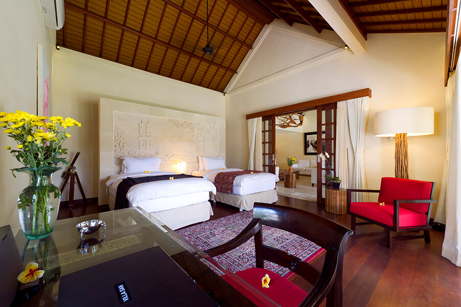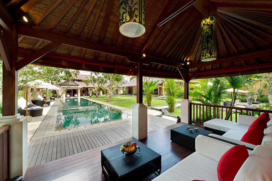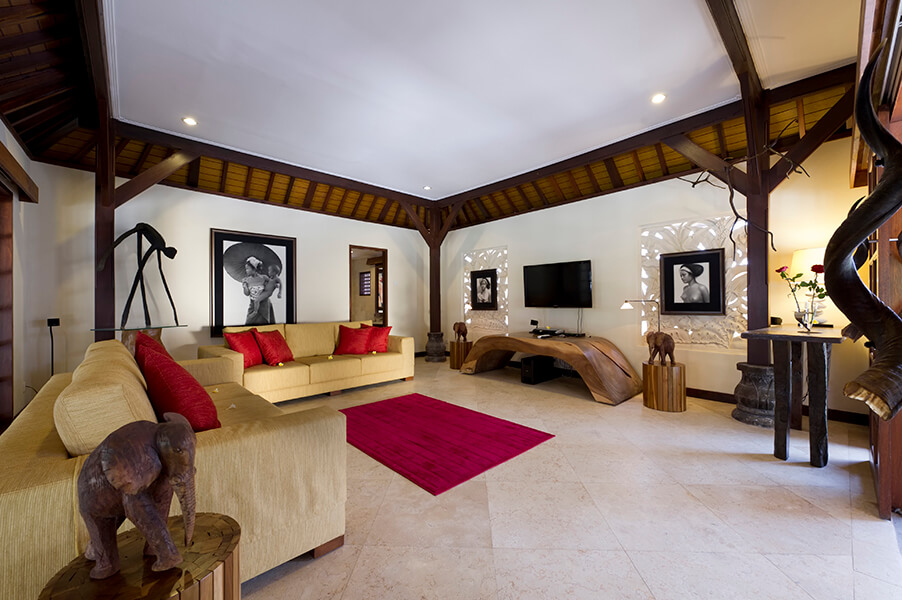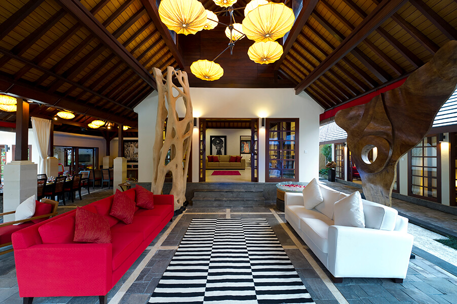 Living areas: Open-sided living area; dining area for 14; entertainment lounge; playroom; studio; garden balé and function room. Bedroom: 12 adults (2 master suites with king bed, one of which is convertible to twin; two king-bedded guest rooms; and two twin-bedded guestroom convertible to king); 2 extra beds available on request for children. Entertainment: iPod dock and speakers in every room; 2 home theatre systems incorporating satellite flat-screen TV, DVD Player and stereo system; books; games; gym equipment; BBQ. Families : Dedicated playroom with DVDs, books and games; pool toys; cots; highchairs. Sports: swimming pool, gym; and unlimited WiFi and the flawless service of its team of staff.