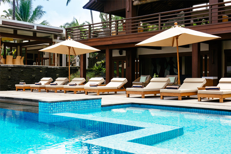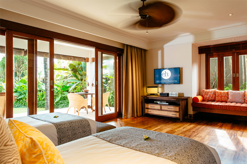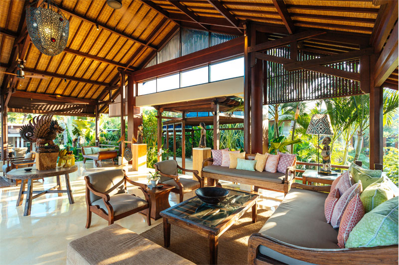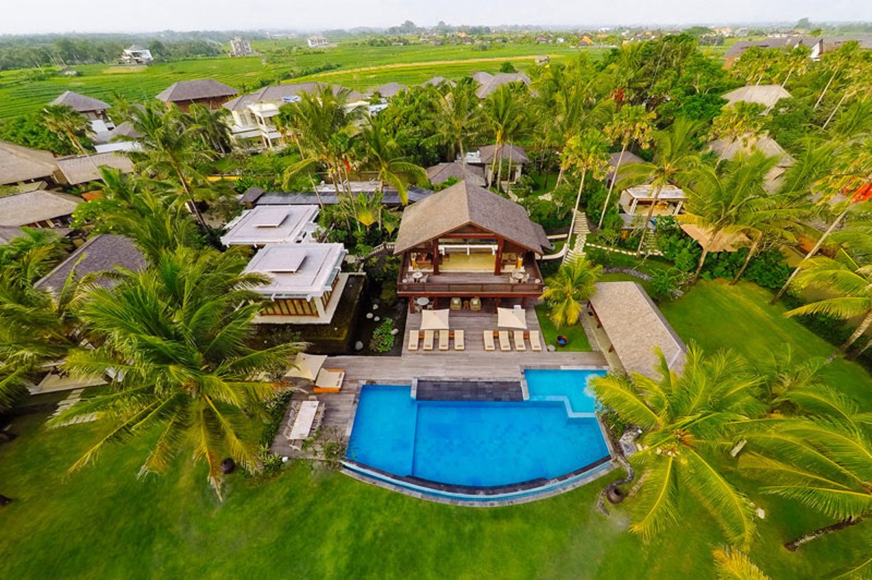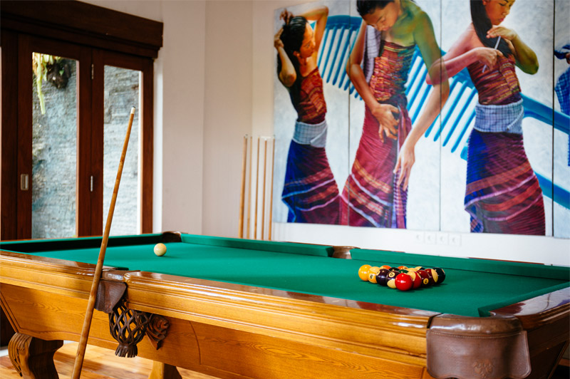 Living areas: Open-sided living room; poolside bar and lounge; media room with pool table; dining pavilion with table for 10; kitchen with breakfast bar; poolside dining deck with table for 10; sunset balé. Bedroom: 10 adults (5 bedrooms: 4 with king-size beds; 1 with twins convertible to a king). 5 extra beds can be set up on guest request at additional charge. Entertainment: 60-inch TV with surround-sound and multiple-zone central music system in media room; 26/40-inch satellite channel TVs in bedrooms; DVD players; Bose iPod docks. For Family: baby cot; high chair; car seat; shallow section in the pool. Sports: swimming pool, Pool table; table tennis; tennis court (shared), volleyball, 2 bicycles.; and unlimited WiFi and the flawless service of its team of staff.