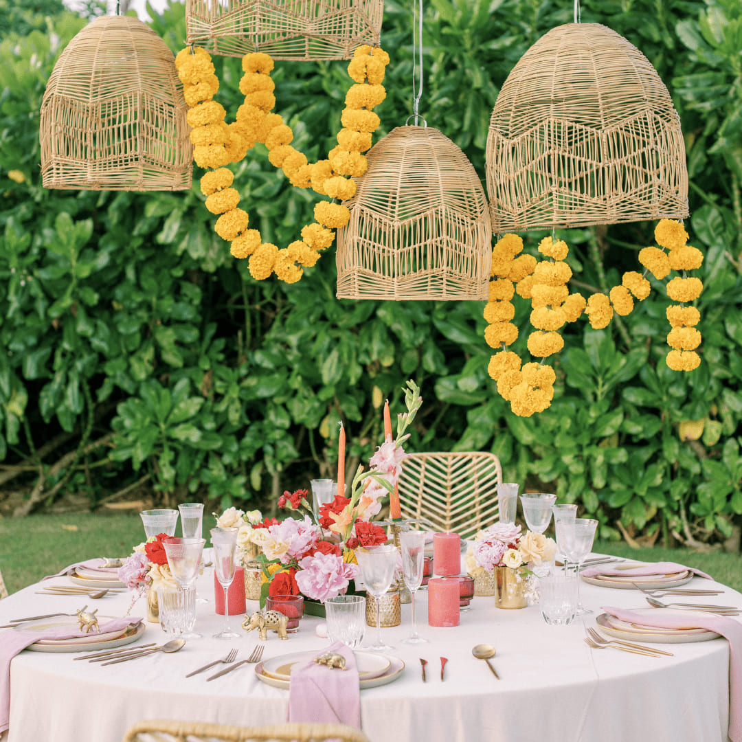 • Dinner decoration includes fairy light/light bulb, bridal table set up for 6 pax with centerpieces and candles, banana trunk with candle, guest centerpieces, registration desk, angpao box, guest book.