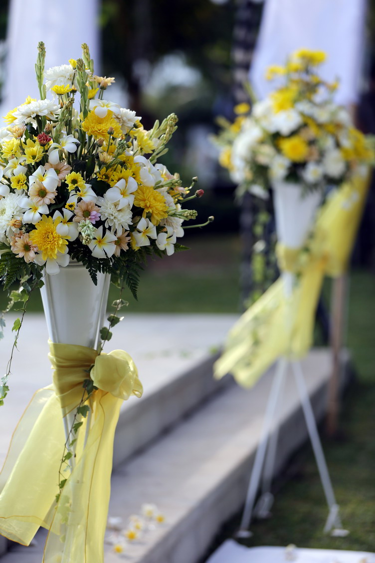 • Fresh Flowers ceremony decoration include : arch flower, altar table and flower centerpiece, flower aisle, flower shower, standing flowers, and welcome board