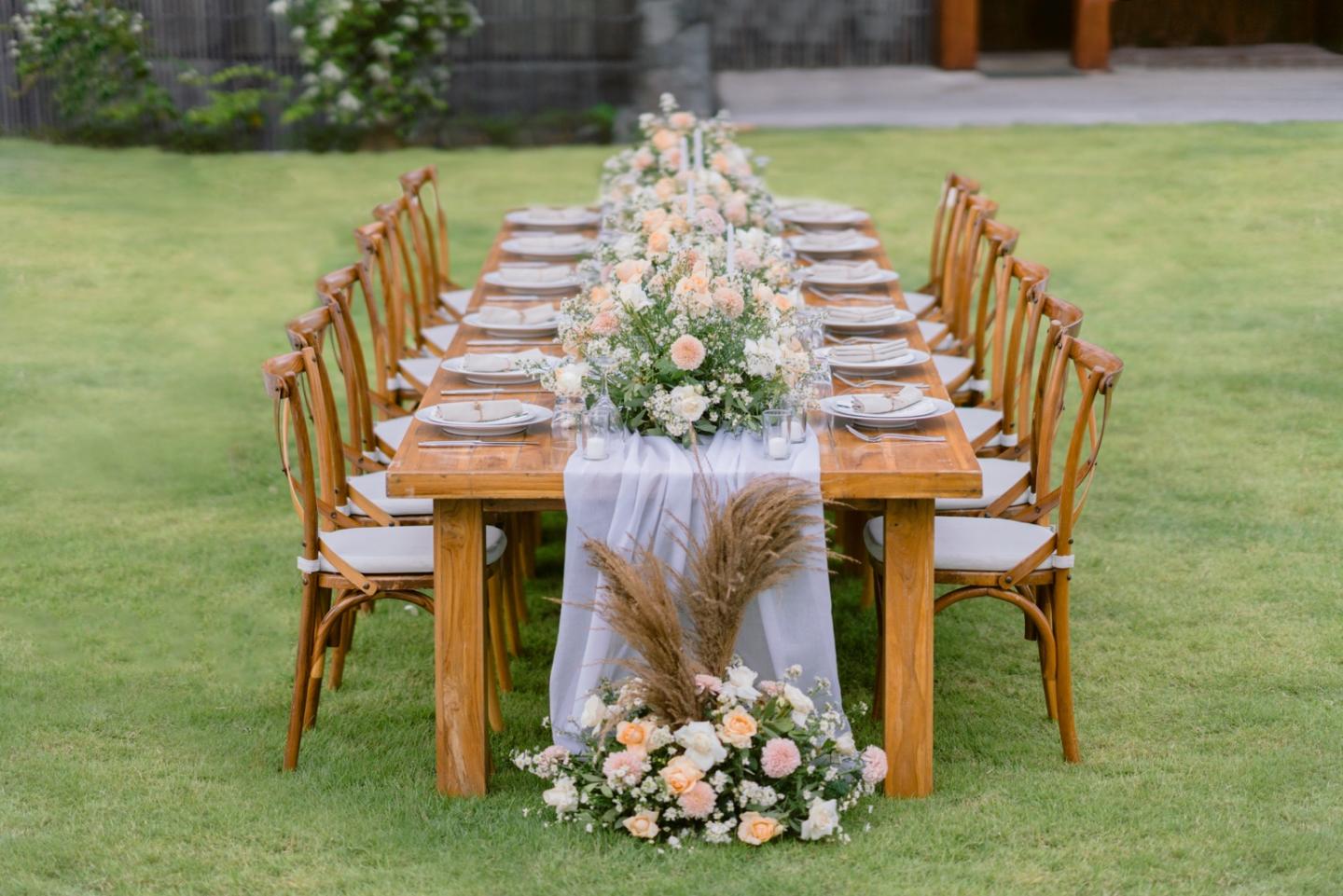 • Ceremony decoration: flower arch, altar table & flower centerpiece, standing flower, flower aisle arrangement, flower confetti, welcome board