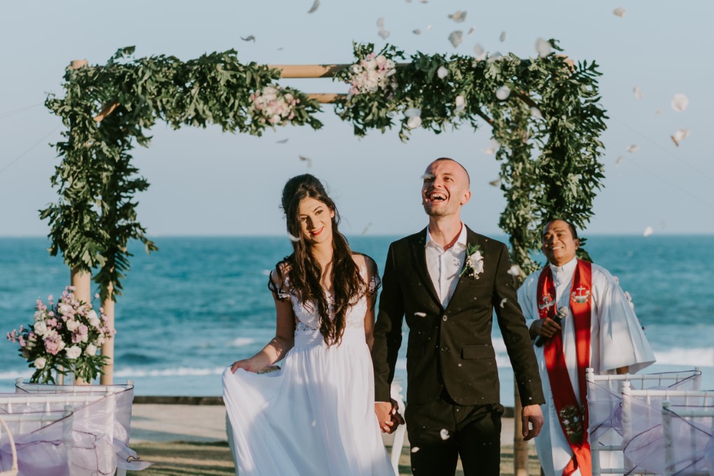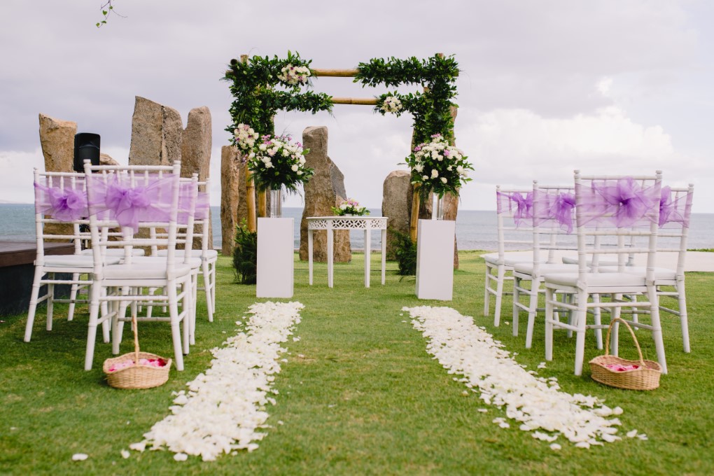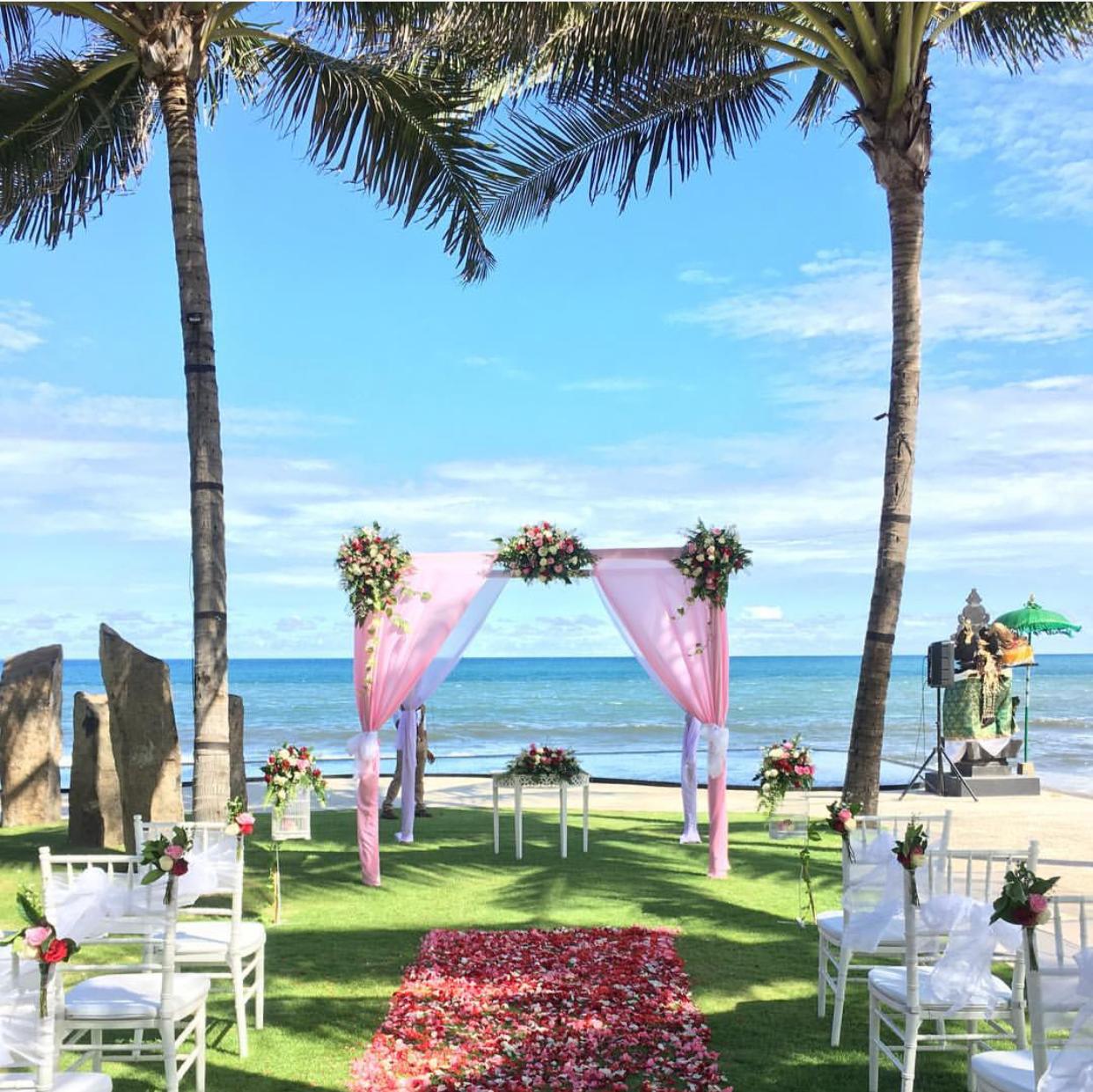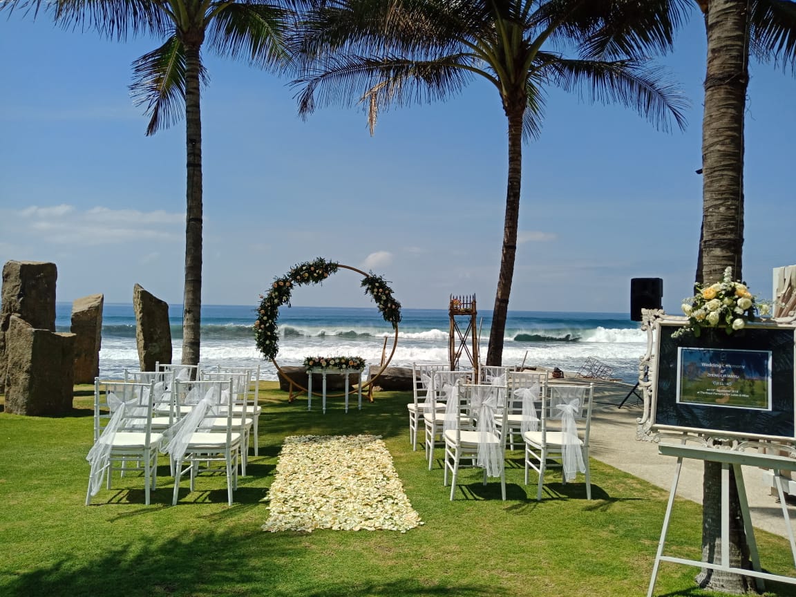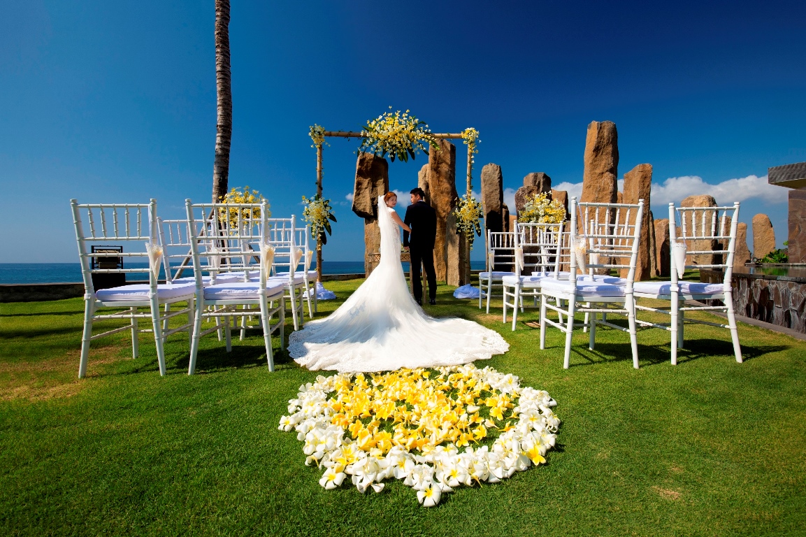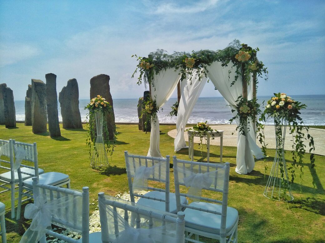 Intimate Wedding package for 10 person at the Royal Purnama, Ketewel, includes one time venue usage at Standing Stones garden-Ocean View, one night stay for bridegroom at one bedroom jacuzzi suite ocean view, fresh flower decoration, bridal bouquet and boutonniere, hairs do and makeup for bride, photography & videography service and wedding coordinator service