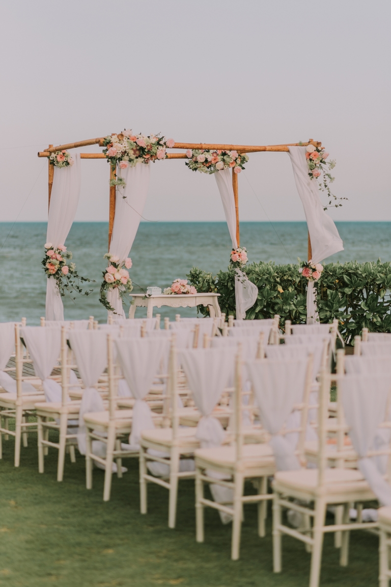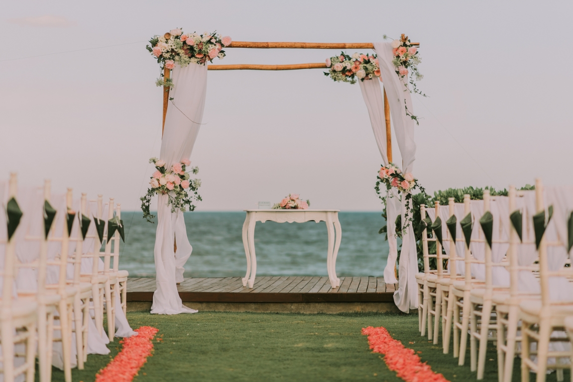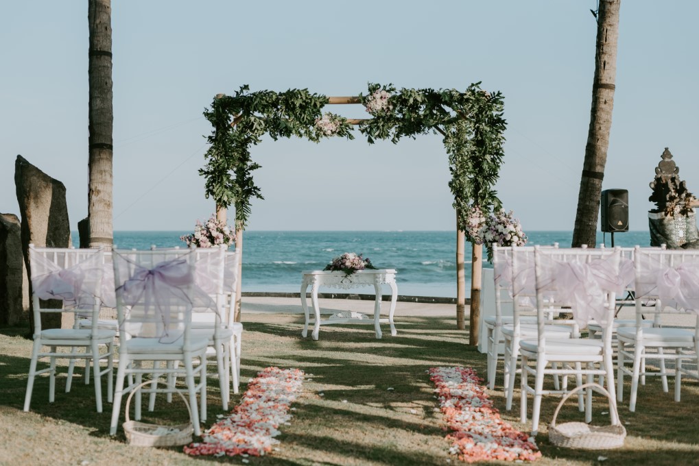 - Ceremony decoration includes wedding arch, altar table with floral centerpiece, ring pillow, flower shower, flower aisle, welcome board