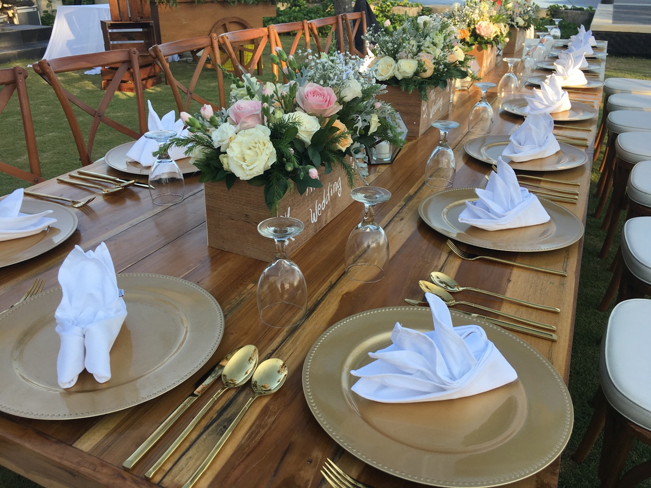 - Dinner decoration includes fairy light/light bulb, bridal table set up with centerpieces and candles, banana trunk with candle, guest centerpieces, registration desk, angpao box, guestbook.